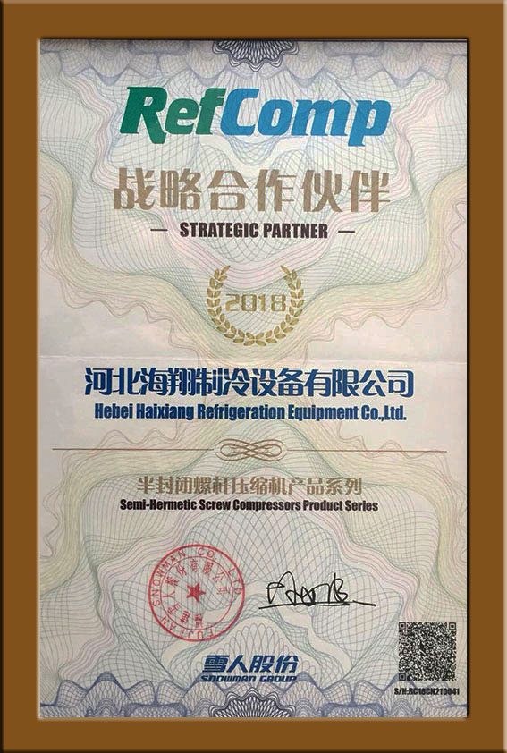 我公司所使用的配件都屬于制冷行業(yè)中世界級(jí)的品牌,2018年我們海翔制冷設(shè)備有限公司與雪人股份旗下的“Refcomp” (萊富康)建立了戰(zhàn)略合作伙伴,今后我公司的一部分壓縮機(jī)將來(lái)自于萊富康.
